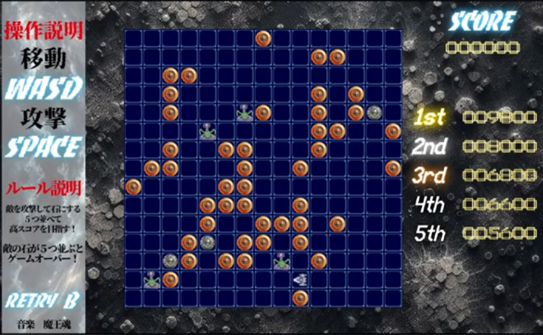 石を増やして5つ揃えて高得点を狙うゲームです。
